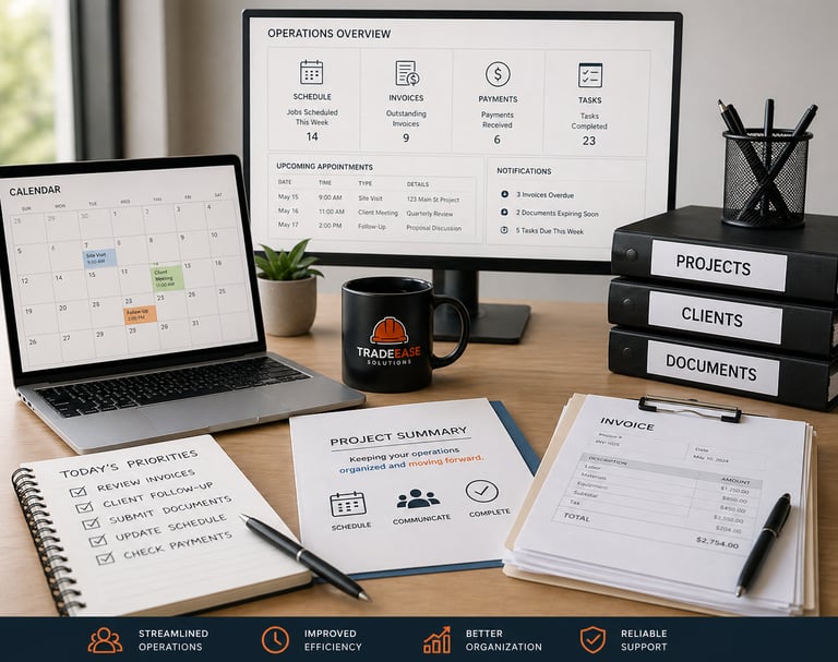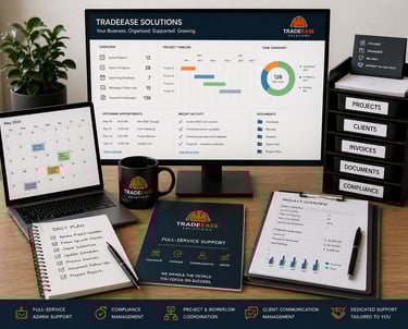 From invoicing and scheduling to compliance and client communication, Trade Ease Solutions provides structured back-office support for contractors, trades businesses, and project-based work, including government-related projects.