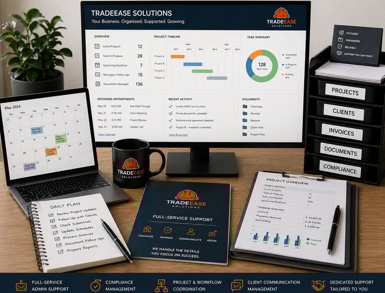 Trade Ease Solutions provides administrative and operational support without the cost of hiring a full-time office team. Our service packages are designed to support contractors, trades businesses, and project-based organizations with reliable, structured back-office support.